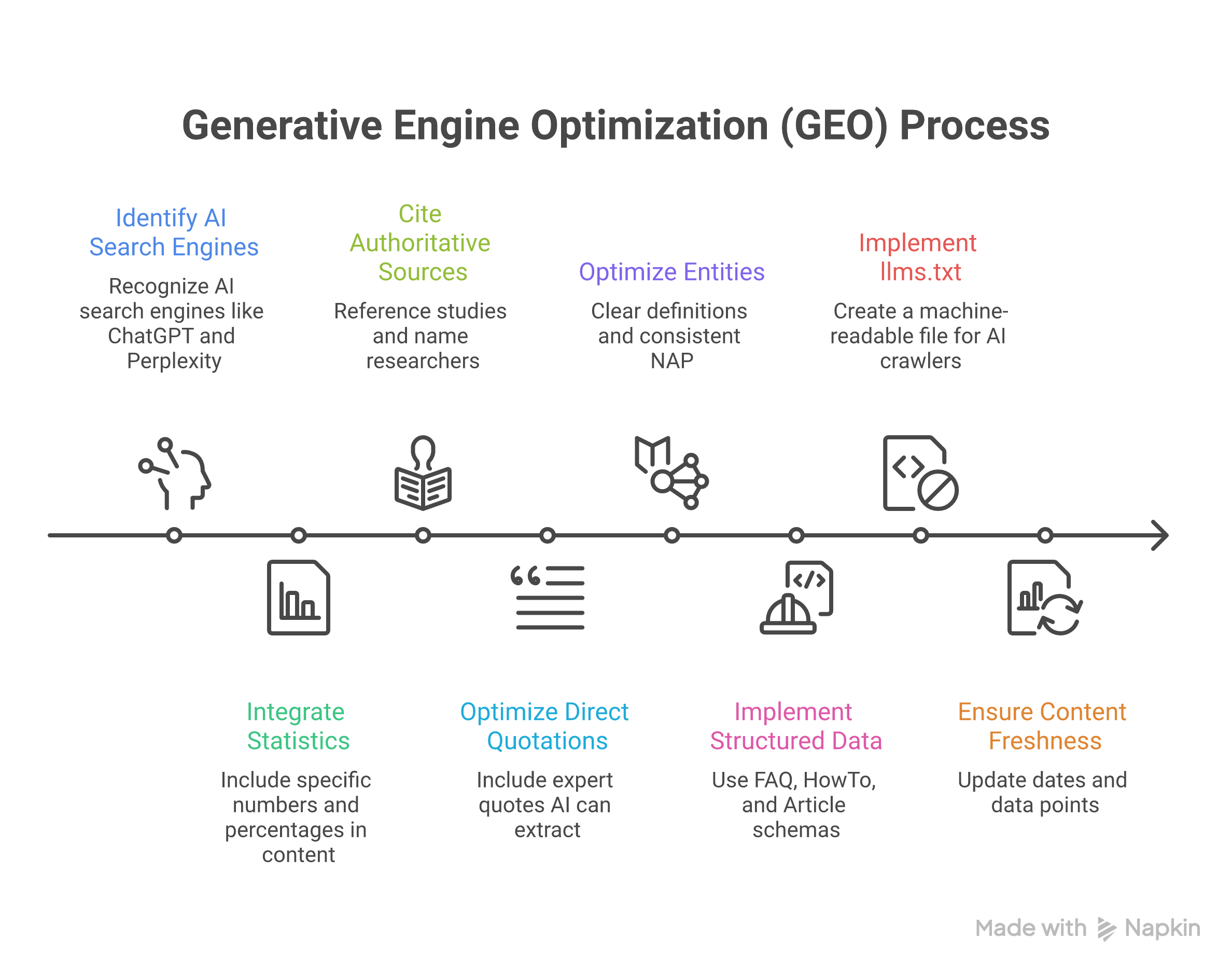 The critical shift: In traditional SEO, you optimize a page to rank for a keyword. In GEO, you optimize individual facts, statistics, and claims within your content so that an AI engine can extract and cite them. A single well-structured paragraph with a clear statistic and named source can generate more AI visibility than an entire page optimized for a keyword.